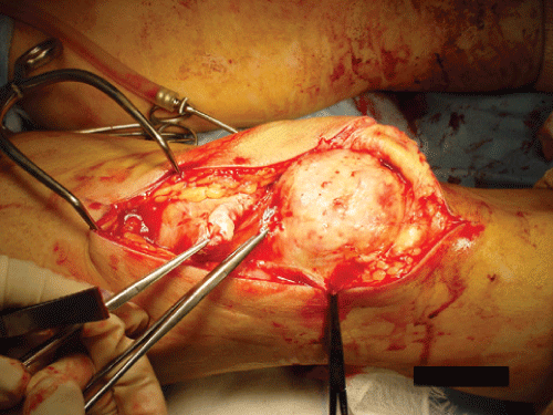 Five days after his injury, a correct diagnosis of bilateral rupture of the quadriceps tendons was made, and seventeen days after injury, the primary surgical repair was performed. At operation, both quadriceps tendons were found to be ruptured at the osteotendinous junction (Figure 4). A freshening of the edges, transosseous sutures were performed (Figure 5). A biopsy was taken from each injured side, and showed the rupture of the tendon, granulation formation, and patellar microfracture. Postoperatively both legs were placed in plaster casts in complete extension for 6 weeks with full weight bearing mobilization. At the end of 3 months, although the patient complained of weakness in both knees, he was walking independently with the aid of one crutch. He had bilateral flexion of 110 degrees and no extension lag on either knee. Radiographs showed patellar height of 1.00 on the right knee and 0.96 on the left knee using the Insall-Salvati method. At follow-up 26 months after repair, clinical examinations revealed a Lysholm score of 97 and a Tegnar activity score of 2, with full extension, no extension lag, flexion of 120 degrees on both knees, and no disturbance on walking without any aids.