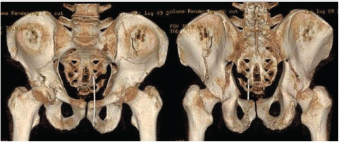 Figure 1: 3d view of ct images showing a complex fracture of both the acetabula (a two columns pattern on the left acetabulum and a t-shaped fracture on the right acetabulum).