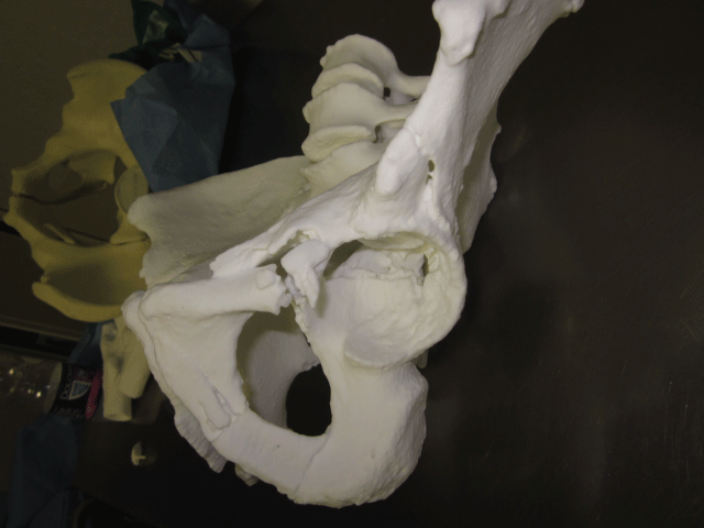 Figure 2: 3D-printed model showing a complex fracture of both the acetabula (a two columns pattern on the left acetabulum and a T-shaped fracture on the right acetabulum).