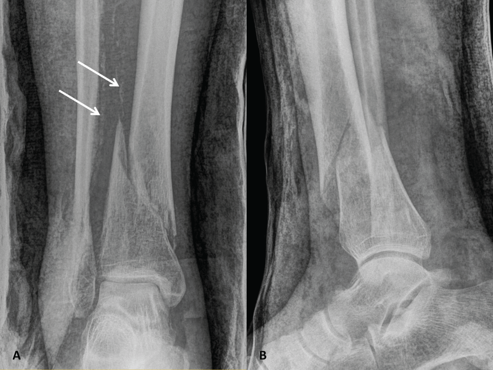 Figure 1: Plain anteroposterior (A) and lateral (B) radiographic views showing a right distal spiroid diaphyseal tibia fracture (AO/OTA type 42-B2) associated with a comminuted distal fibula fracture. Arrows indicate diffuse calcifications of infra-popliteal vessels.