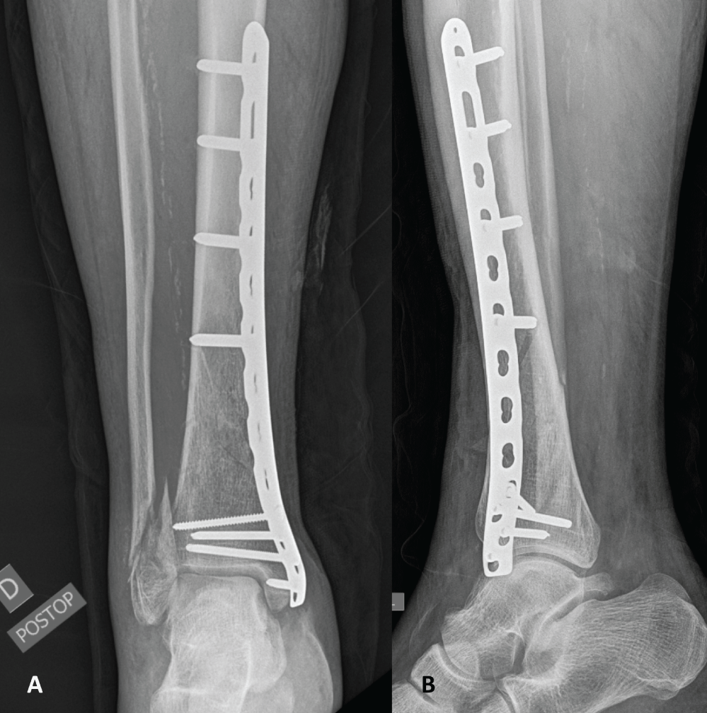 Figure 4: Plain anteroposterior (A) and lateral (B) radiographic views following distal tibia fixation revealing adequate reduction.