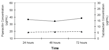 All subjects received a 4/0.5 g bolus dose of piperacillin/tazobactam over 30 minutes followed by a 16/2 g per day continuous infusion. Serum piperacillin/tazobactam concentrations were analyzed at 30 minutes after the bolus dose (Cmax) and at steady-state (Css) during the continuous infusion (24, 48, and 72 hours). Piperacillin/tazobactam serum concentrations were determined using high-performance liquid chromatography.