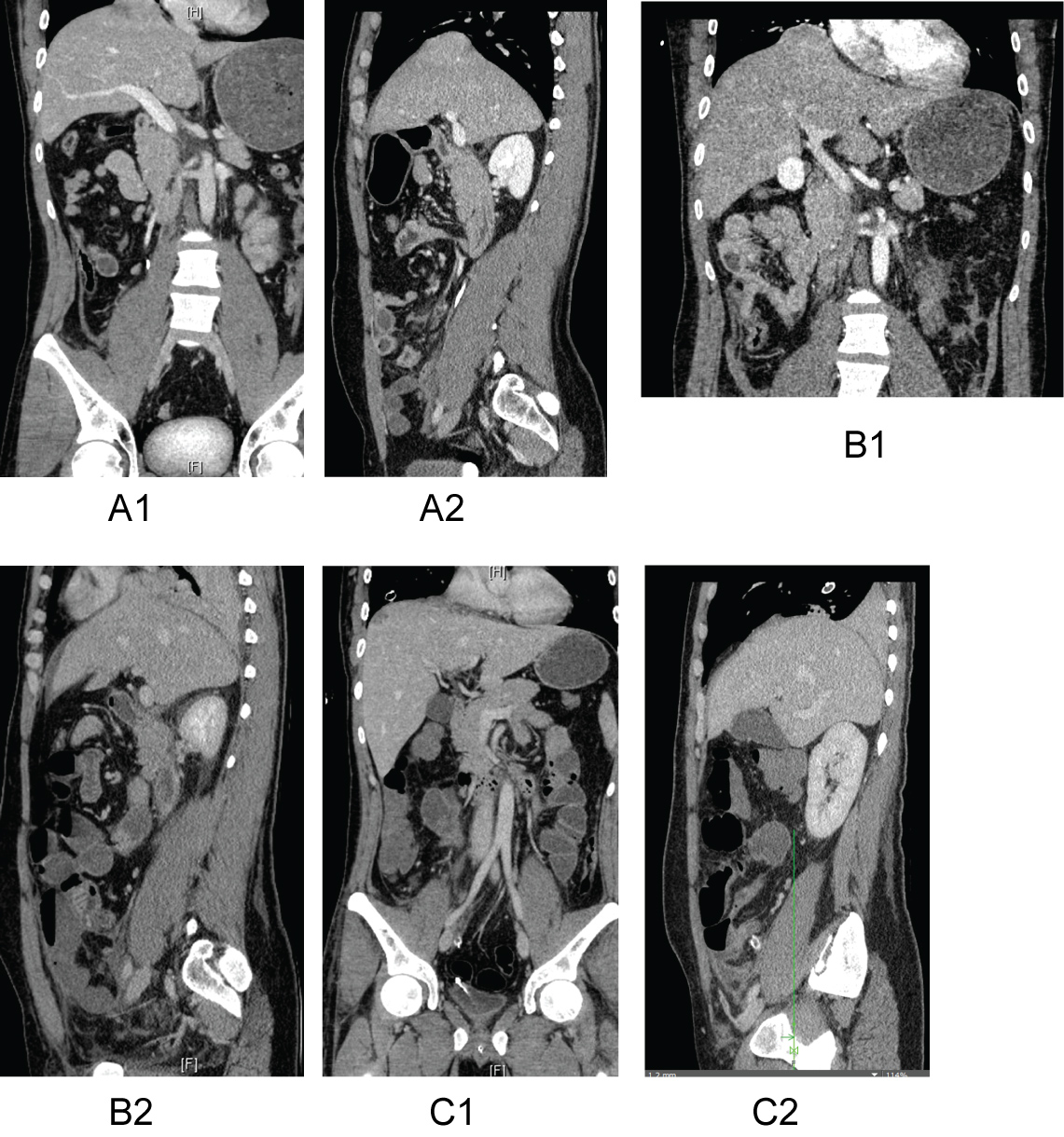 Figure 1: A1 and A2) Initial trauma CT scan with no clear evidence for RTDR although retrospectively one could have suspected a beginning rupture. B1 and B2) After two days, a distinct rupture of the right-side diaphragm could be observed. Coronal and sagittal sections show a liver herniation through the diaphragm into the thorax. C1 and C2) After operative treatment with suture of the diaphragm, no rupture and residual no herniation of the liver can be observed.