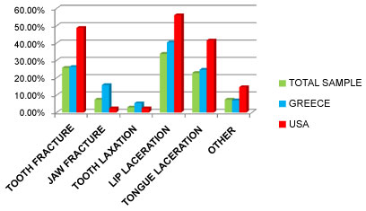 According to Perunski, et al. some dental injuries require extended, even continuous follow-up treatment, which incurs associated expenses [7]. In the present study, 59.1% of Greek and 50% of American non-users reported injury. This was higher than other similar studies [7,16,20]. For both Greek and American players, lip laceration was the most common injury, which corresponds with other studies [3]. Fractures reported in other studies ranged up to 17.7% [17]. The present study identified fractures at 7.4% and 25.7% for jaw and tooth fractures respectively. The discrepancy could be explained by the fact that other studies did not specify fracture type. According to literature, the frequency of oral and dental injury occurrence is affected by how much time is spent playing. Wenli Ma found that there was an 80.5% injury incidence rate among Chinese basketball professionals, while the rate among semi-professionals was a significantly reduced 37.7%, which may be accounted for by the greater time professional players spend on the court [12].