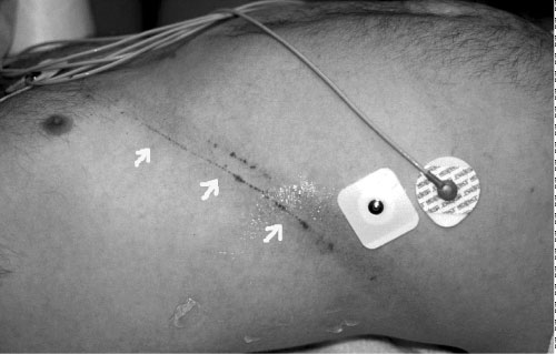 Figure 1: Contusion over the right chest from the seat belt (arrows). View Figure 1