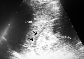 Figure 2: FAST examination shows fluid in Morison's pouch (arrows). View Figure 2