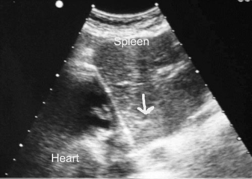 Figure 3: FAST examination shows hyperechoic areas on the spleen from a contusion (arrow). View Figure 3