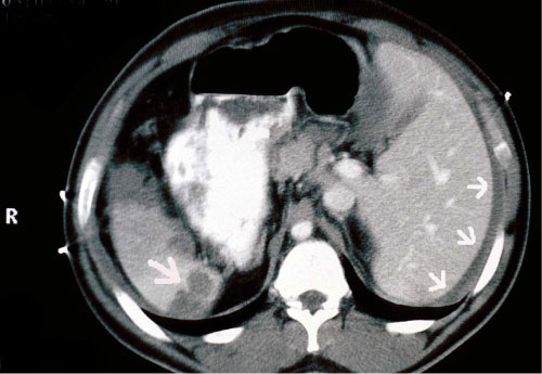 Figure 4: CT scan show perihepatic fluid (arrows on the right) and splenic contusion (arrow on the left). View Figure 4