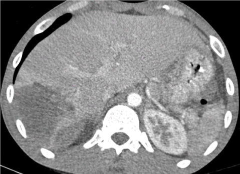 Figure 1: The contrast computed tomography (CT) scan demonstrates a large parenchymal hematoma in segment 6 and 7 of the liver with no active extravasation and an intraparenchymal hematoma of the spleen. View Figure 1