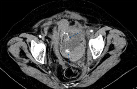Figure 2: CT reveals extravasation of contrast material within a pelvic hematoma. View Figure 2