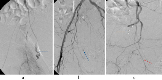 Figure 3: a,b) Transfemoral digital artery angiogram of right pelvic side shows active bleeding from a branch of interior pudendal artery; c) Proximal transcatheter selective embolization of the vessel with spiral coils was achieved and the bleeding was stopped. View Figure 3