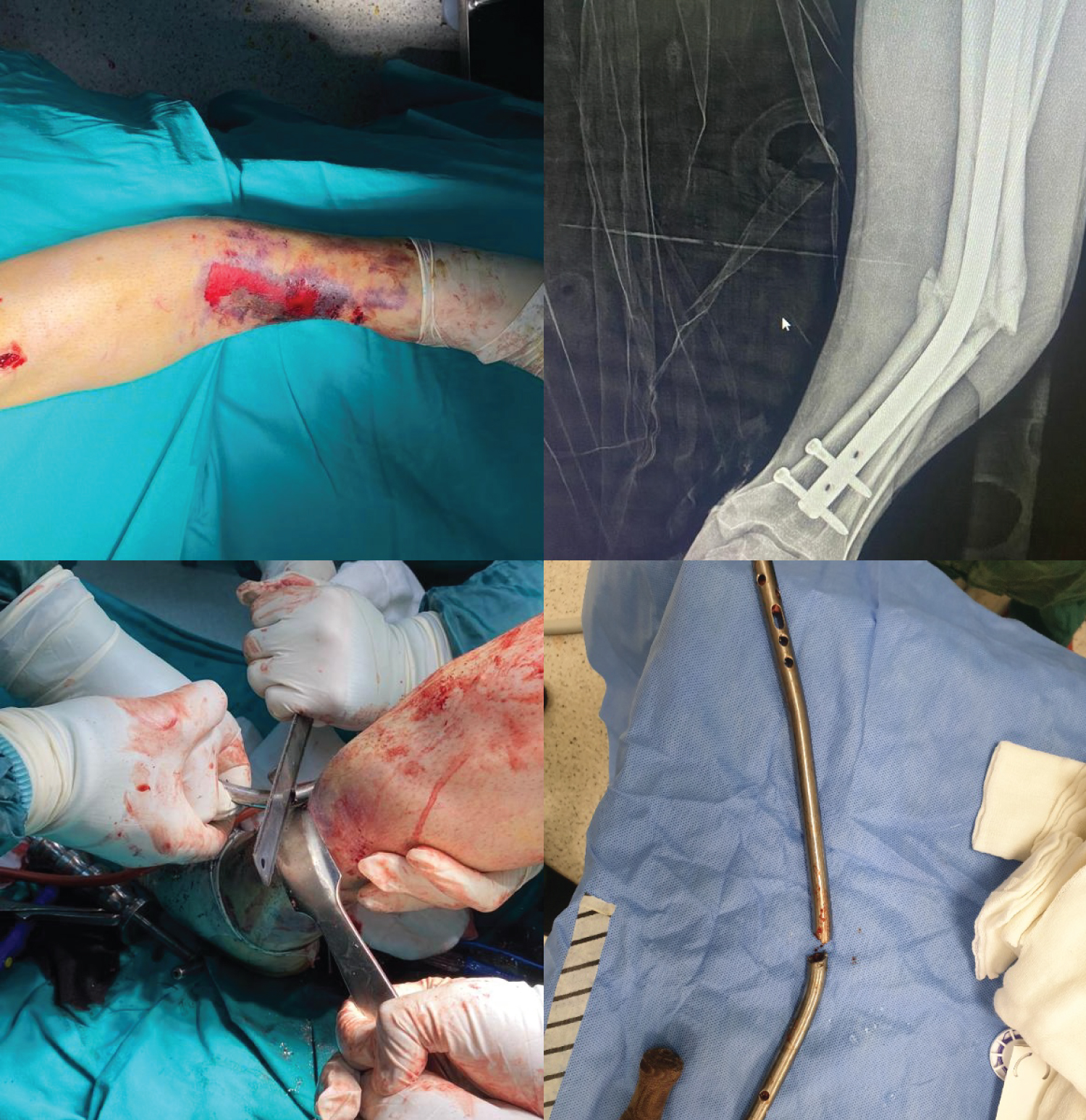 A 21-year-old male involved in a motorcycle accident sustained a left open tibial fracture and was treated with an IMN in another medical center. During the postoperative period and follow-up, the fracture healed and patient returned back to his previous level of activity within 6 months. However, the patient had a traffic accident again and applied to the emergency department with this complaint. On physical examination, there was a fixed varus deformity of his leg. Both knee and ankle range of motion were normal, and neurovascular status was intact. Plain radiographs showed a re-fracture of the tibia and 30 of angulation of the nail in the coronal plane. Under spinal anesthesia and tourniquet control, patient in supine position, a manual straightening of the nail was first attempted under fluoroscopic control but resulted with failure. An incision was made from the fracture line, then the nail was exposed, the screws in the distal and proximal sections were removed. Then it was cut from the bending line with a metal drill (with saw) and then removed in two parts (Figure 1). Then the fracture was reduced and an 11 mm titanium nail was inserted.